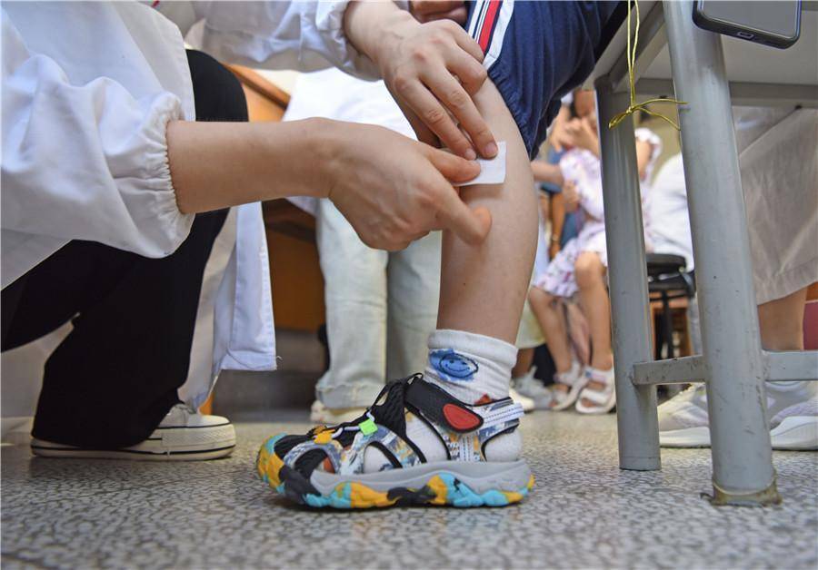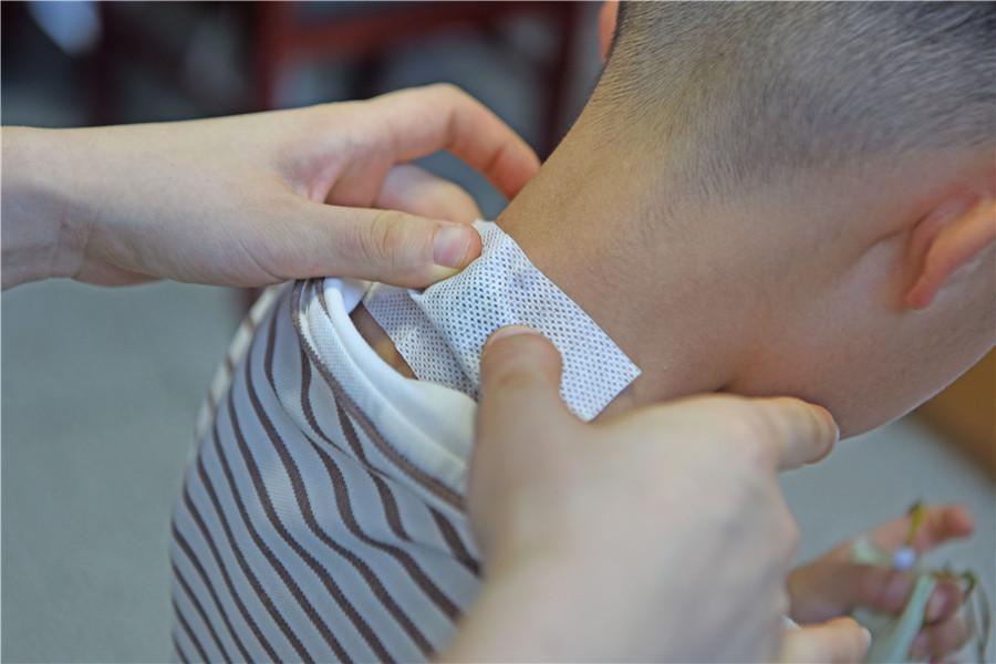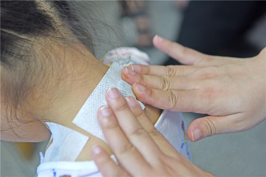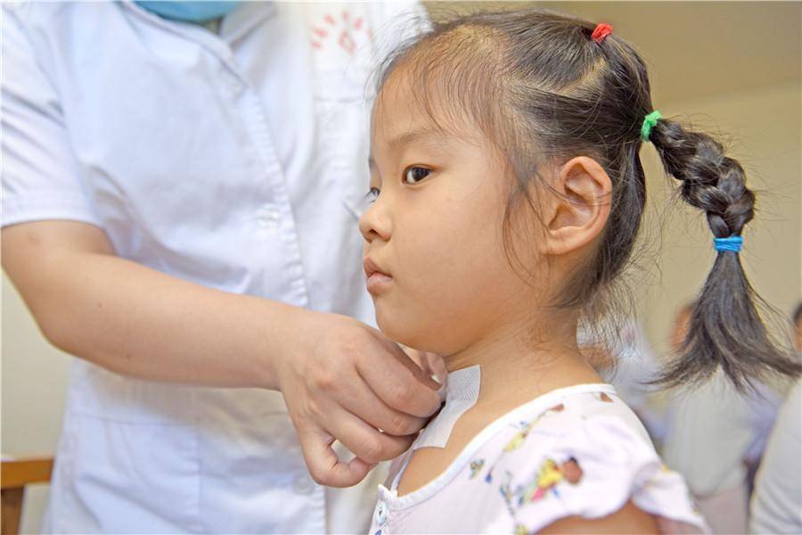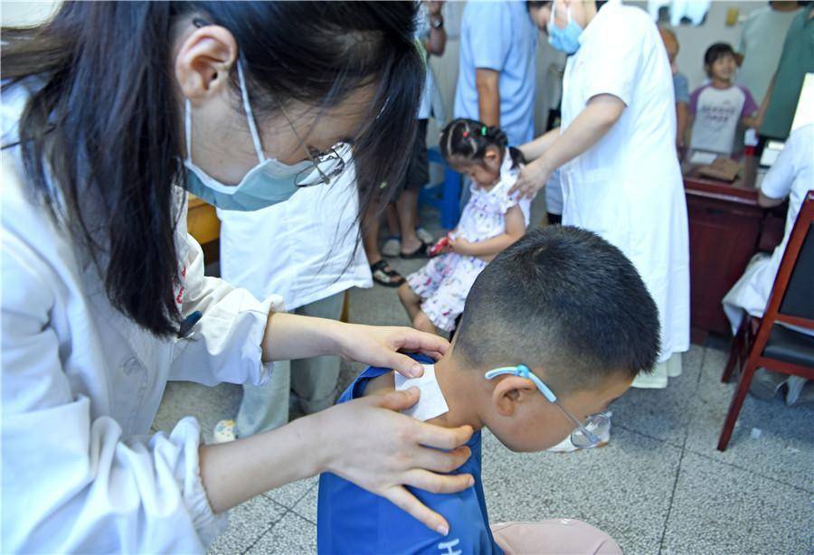 上海曙光医院淮南医院(淮南市中医院),医务人员为小朋友贴“三伏贴”。