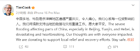 7月30日,苹果公司首席执行官蒂姆·库克在微博发文称,“中国多地,特别是京津冀地区遭遇严重洪灾,令人痛心。我们心系每一位受影响的人。我们将捐款支持当地的救援与灾后重建工作。愿大家平安。”